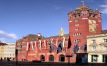 Кметството, изградено от червеникав камък, впечатлява със своята богата украса и внушителна фасада.