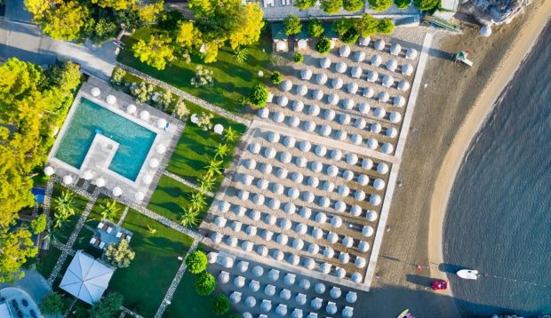 Собствен, пясъчен плаж с ширина 180 м, удостоен със син флаг. Чадъри и шезлонги на плажа и при басейна - безплатно.
