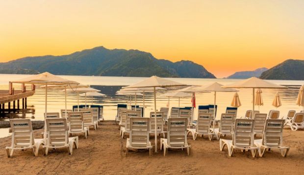Собствен, пясъчен. Чадъри, шезлонги и матраци на плажа и при басейна - безплатно.